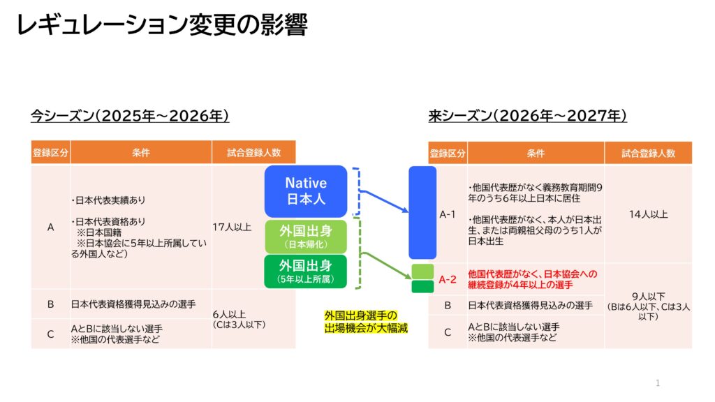 リーグワンでは日本出身選手の出場機会を増やすことを目的に選手の登録規定の変更を昨年決定し、来シーズン(2026年~2027年)より実施されることとなりました。具体的には、今シーズンは選手登録枠が多い区分Aに所属していた外国出身選手(帰化選手含む)の大半が、来シーズンより登録枠の多い区分A-1(従来の区分AをA-1とA-2に分割)ではなく区分A-2の登録となります。区分A-1には日本生まれの日本人に割り当てられるため、日本人の出場機会が大幅に増えることとなります。